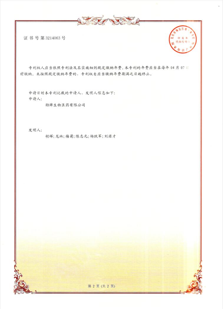 1月11日,由胡輝、龍林、梅菊、陳志元、楊躍軍、劉源才6人提出的《一種具有輔助降血糖功效的低分子量青稞β-葡聚糖的制備方法》獲得發明專利。該專利為勁牌公司2019年自然年度獲批的第一項發明專利。