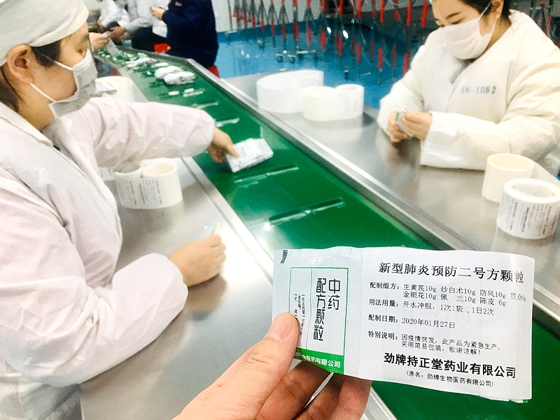 1月27日晚10點(diǎn),勁牌持正堂藥業(yè)制劑車間燈火通明,車間員工正在加班生產(chǎn)新型冠狀病毒肺炎預(yù)防中藥配方顆粒。該中藥配方顆粒按照湖北省衛(wèi)健委《關(guān)于印發(fā)湖北省新型冠狀病毒感染的肺炎診療指南的通知》中的中醫(yī)預(yù)防二號(hào)方進(jìn)行調(diào)配和生產(chǎn)。
